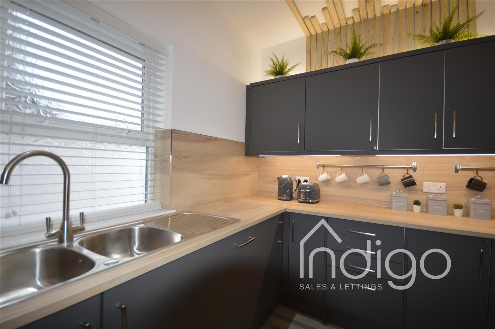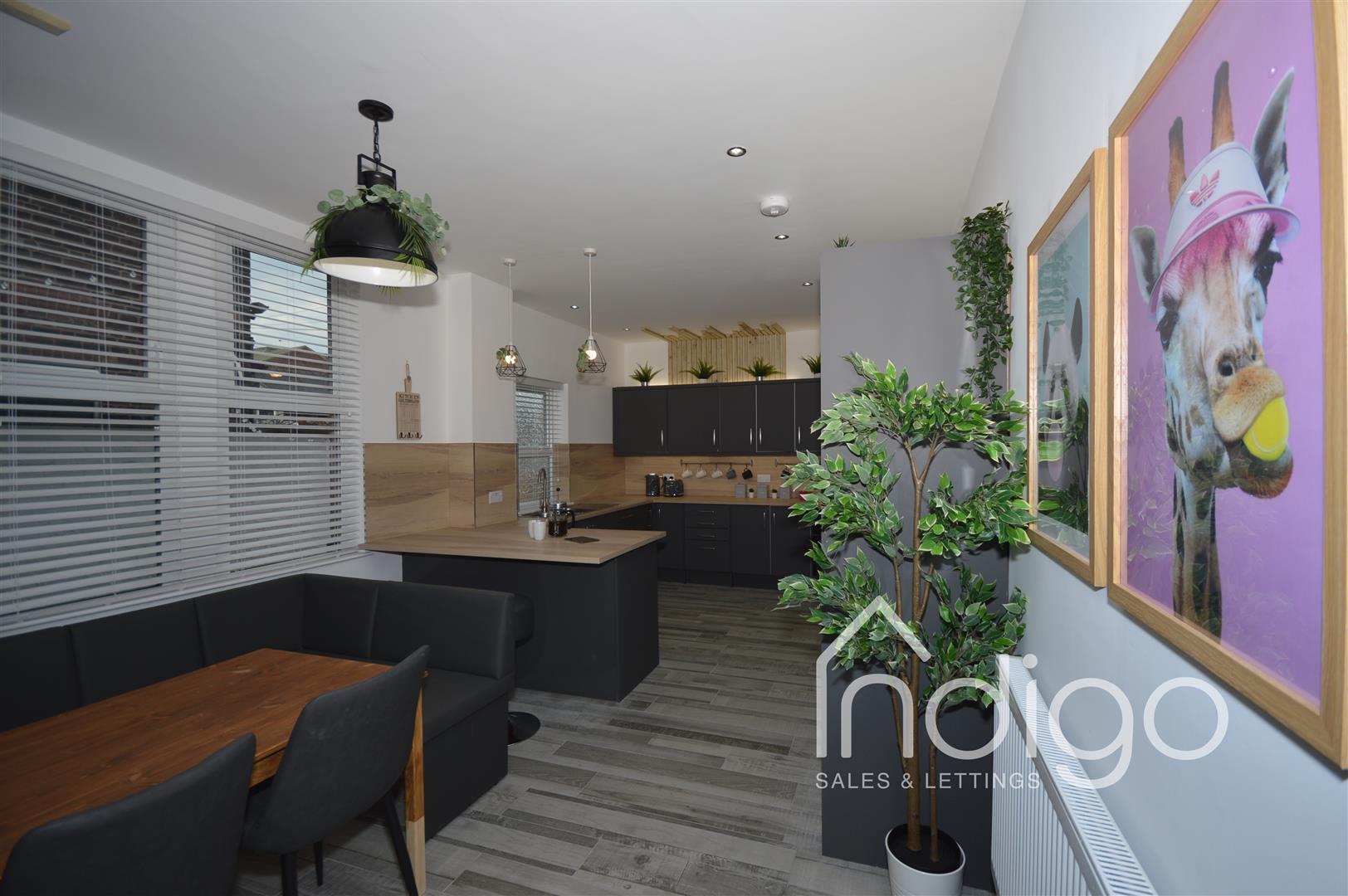 A large open kitchen with all the appliances' you would expect from a top grade kitchen design, wood panelling design feature, dishwasher, double sink, gas hob and bench seating for enjoyable dining or lounging chats. And access to the rear area, lit with festoon lights and secured with wood panelling with gateway to the parking